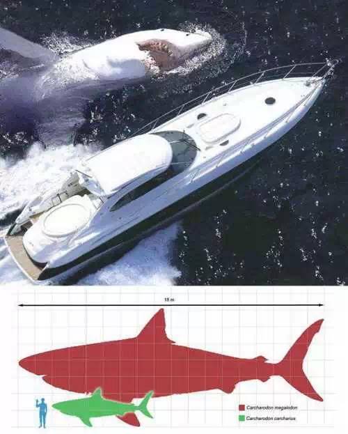 4.巨齒鯊:大白鯊的祖先,長度可達18米(圖中可以看到巨齒鯊和大白鯊以及人類的比例),還好巨齒鯊在260萬年前滅絕了。